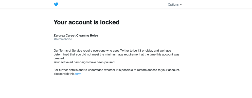 So… if your business is less than 13 years old, don’t use the start date as the birthdate. Twitter will lock you out of your account…